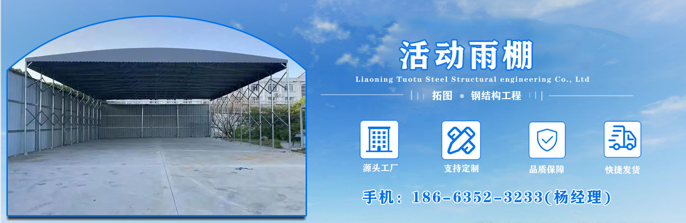 遼寧拓圖鋼結構工程有限公司是一家專業從事推拉篷設計、制作、安裝、使用、維修的綜合性公司。公司主營:活動雨棚,大型倉儲蓬,移動推拉雨棚,電動伸縮雨篷,推拉棚廠家等。  遼寧拓圖鋼結構工程有限公司堅持以市場為導向,以科技創新為動力,以質量求生存,以誠信為準則,倡導求實、進取、創新的企業精神。“科學的管理、嚴謹的設計、 的制作安裝、嚴格的質量檢測、良好的后期服務成就企業的信譽,為您提供優質服務。  遼寧拓圖鋼結構工程有限公司傾力于開發應用三維空間結構與新材料的結合,將廣告藝術視覺表現形式與張力膜材科學的結合,推出多彩推拉蓬,依靠先進的科學技術,將推拉蓬建筑表現形式無限延伸,立志走在建筑科學的前沿,引導建筑時尚潮流,我們的目標是使推拉蓬建筑在中國發展壯大。  遼寧拓圖鋼結構工程有限公司憑著極強的事業熱情和豐富的專業經驗以“勤勉進取、銳意創新、至誠至信”的精神使公司得到迅速健康發展,業務范圍遍及全國。科學的管理、嚴謹的設計、高標準的制作安裝流程,嚴格把控產品質量,熱誠的售后服務是企業競爭力的源泉。  遼寧拓圖鋼結構工程有限公司人愿以最誠摯的態度,歡迎廣大客戶的蒞臨與溝通!愿為市場提供優質的產品,愿為客戶提供滿意的服務,愿為您的事業助一臂之力!...
